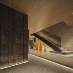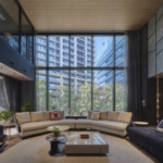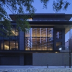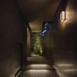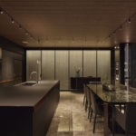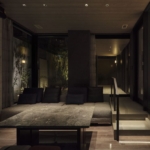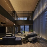 The curtain wall of the two-story atrium in the LDK borrows the view of trees on the neighboring land, creating the atmosphere of a villa in the woods, which is hard to imagine being so close to a major station in Tokyo. From the gate to the entrance of the building, a retractable path leads through a green garden where one can feel the four seasons, creating a calm approach space that gradually leads one away from the hustle and bustle of the city and into a more serene space. A stone waterfall with a modest sound of water is placed along with the lounge and entrance hall, which can also be used as a place for relaxation along the garden.