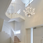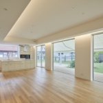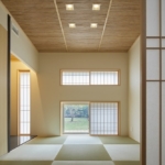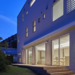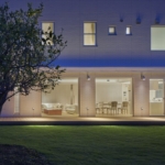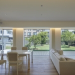 Two facades, one on the street side and the other on the orchard side, each draw light into the interior space.