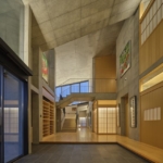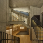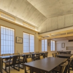 それぞれの用途に切妻の屋根の分節を定め、折れ線位置によって空間の高さが変わっていく。また妻側のスラブの間が開口部となって光が差し込む。これらが一枚の屋根スラブから作られることで、建築全体がおおらかに連なっていく空間を実現した。
